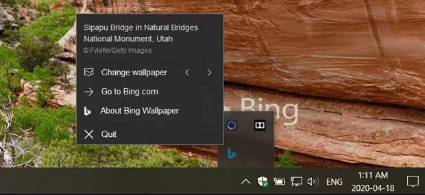 و ستظهر لك أيقونة بينغ في الأسفل قرب الساعة ، يمكنك الضغط عليها للحصول على معلومات حول الخلفية الحالية ، أو لتغيير الخلفية أو العودة للخلفية السابقة . و للعلم لسنوات و العديد من المستخدمين يلجؤون إلى أدوات خارجية لتعيين صور بينغ كخلفية ،لكن الآن أصبحت توجد أداة مجانية مدعومة من طرف مايكروسوفت .