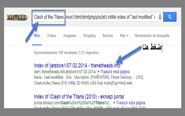 3–شاهد أني وضعت فيلم Clash of the Titans أمام الكود وظهرت أول نتيجة ، وهي التي عليك الضغط عليها ، ليتم تحويلك إلى صفحة تجد فيها روابط التحميل المباشرة كما في الصورة