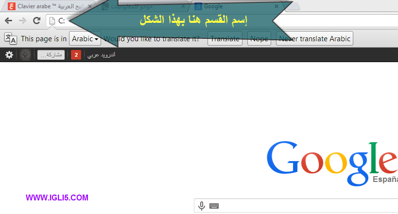 للقيام بهذه العملية والإستمتاع بالسماع للمقاطع الصوتية على متصفحك دون الحاجة إلى البرامج ، تقوم بكتابة أعلى المتصفح إسم القسم على جهازك الذي تتوفر فيه على مقاطعك الصوتية أو المرئية كما في الصورة التالية