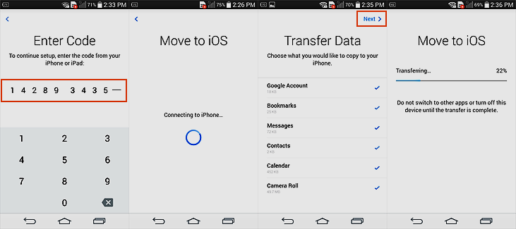 ثالثاً : قم بتحميل تطبيق Move To IOS على هاتفك الأندرويد من الرابط أسفل التدوينة ثم قم بفتحه واضغط على متابعة لتحصل على نافدة بها خانة إدخال أرقام المصادقة التي حصلت عليها من الأيفون وستبدأ عملية المصادقة بين الهاتفين ومن النافدة التالية قم بتحديد البيانات التي تود نقلها من هاتفك الأندرويد إلى الأيفون ثم انقر على زر التالي لبدأ عملية النقل كما في الصورة