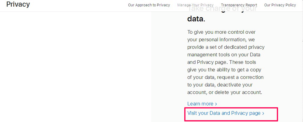 3- اتجه إلى قسم ” تولي المسؤولية عن بياناتك – Take charge of your data ” انقر فوق زيارة صفحة البيانات والخصوصية