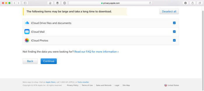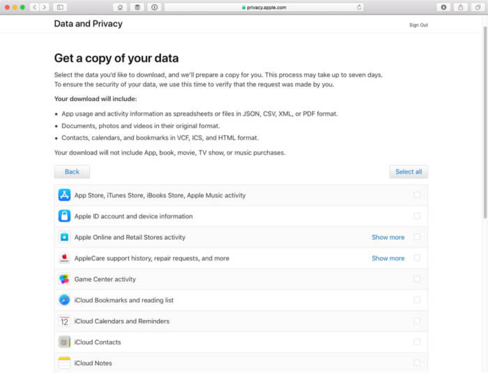 7- في صفحة ” الحصول على نسخة من بياناتك ” ، يمكنك اختيار نقاط البيانات التي تريد تنزيلها. حدد النقاط التي تريدها، أو انقر فوق الزر Select All إذا كنت تريد كل شيء.