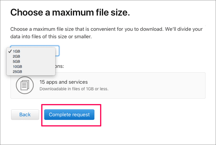 9- سوف تطلب منك الصفحة التالية اختيار الحد الأقصى لحجم الملف. ستنقسم البيانات إلى الأجزاء التي تحددها هنا. قم بتحديد العناصر في القائمة المنسدلة ثم انقر على إكمال الطلب.