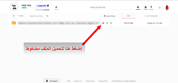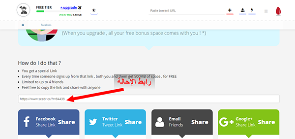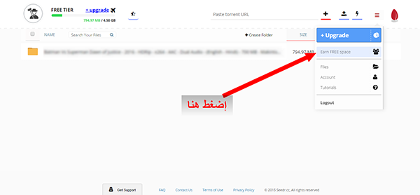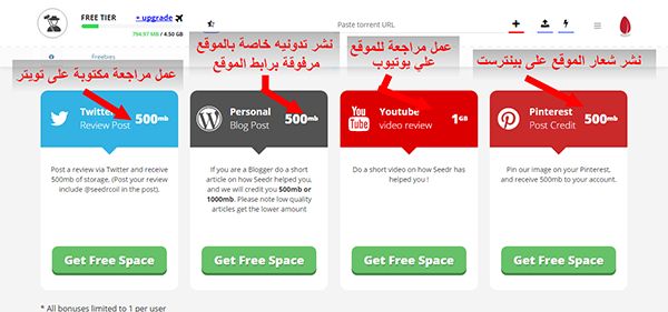 ملاحظة:لا يمكنك تجاوز مساحة 8 جيجا بايت كمساحة إضافية كما يمكنك حذف الملفات على الموقع لتفريغ المساحة و رفع ملفات تورنت أخرى كأنك تتعامل مع قرص صلب .