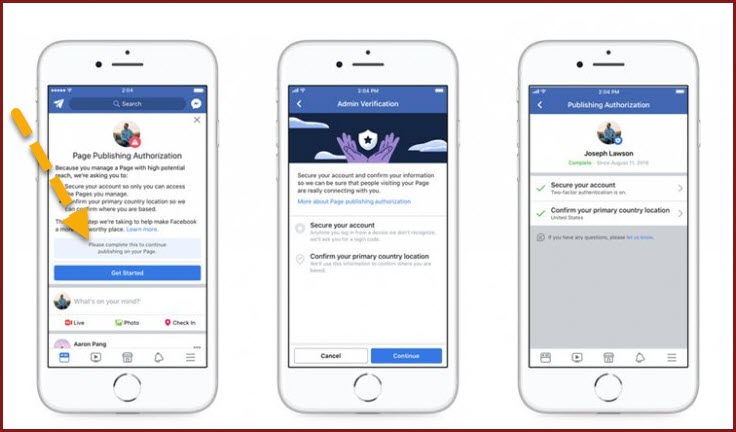 هذه العملية إلزامية ، لذلك سيكون على المسؤولين الامتثال بها ، إذا كانوا يرغبون في متابعة النشر على صفحتهم وعلى موقع الفيسبوك ، و حتى يتم الانتهاء من العملية   ، سيتم تعليق إمكانية النشر. و ستتم إضافة هذه المعلومات الجديدة المطلوبة للمسؤولين في قسم جديد يسمى الأشخاص الذين يديرون هذه الصفحة .