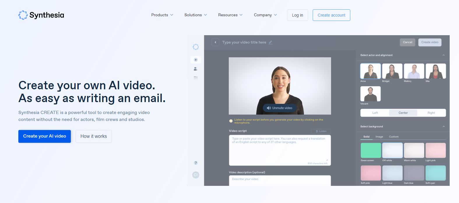 هذا ما يقدمه synthesia.io ، مقاطع الفيديو التي تم إنشاؤها باستخدام أنظمة الذكاء الاصطناعي ، حيث الشخص الذي يقرأ نصنا ليس رسما كاريكاتوريا بل هو شخص يحرك شفتيه بالتزامن مع النص .