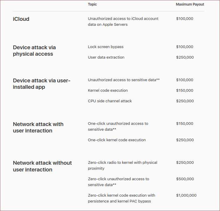 الحد الأدنى للمكافآت هو 25000 دولار ، ولكن يمكن أن يصل إلى 500000 أو مليون دولار اعتمادًا على شدة الثغرة ، . يمكنك قراءة قائمة مفصلة من أمثلة المكافآت على موقع أبل على الرابط التالي : Apple