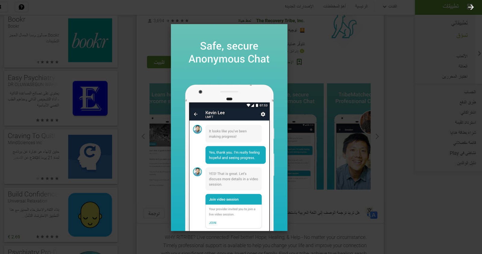 يعد تطبيق RTribe واحد من اهم التطبيقات التي تركز بشكل كبير علي ادمان الاباحية حيث انه يتيح لك الدردشه بطريقه مجهوله مع المحترفين عن طريق جلسات نصيه او محادثات فيديوا مع مستشارين في هذا المجال عملوا لسنوات في مجال القلق والاكتئاب والادمان.
