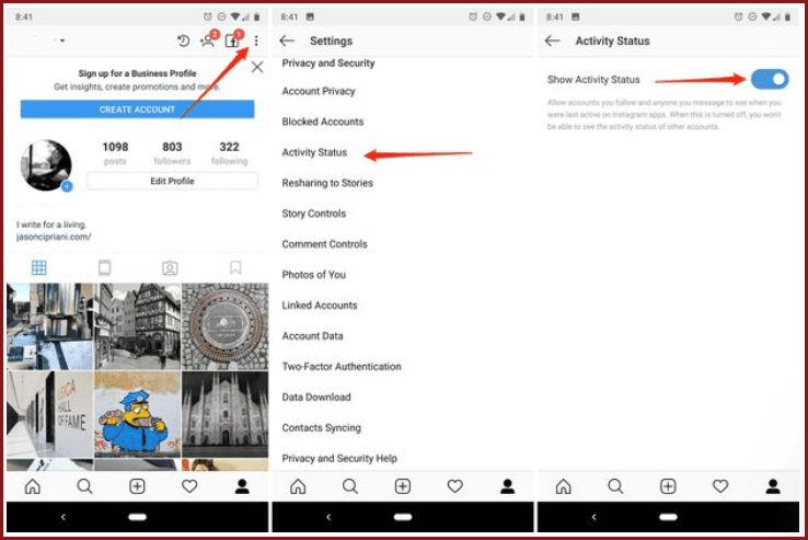 على الأندرويد يحتاج مستخدمو Android إلى فتح التطبيق ، ثم النقر على علامة تبويب الملف الشخصي – إنه رمز الصورة الظلية في الركن السفلي الأيسر. ثم انقر فوق رمز النقاط الثلاث في الزاوية العلوية اليمنى. قم بالتمرير لأسفل حتى تجد قسم الخصوصية والأمان. حدد حالة النشاط من القائمة ، ثم قم بتبديل مفتاح التبديل إلى وضع إيقاف التشغيل.