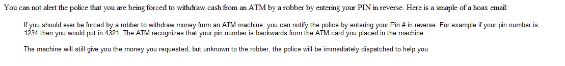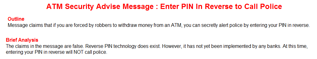 في خبر مثير للإهتمام ينتشر عبر الايميل والشبكات الإجتماعية خصوصا منها فيسبوك ، مفاده انه في حالة اخراج نقودك من الصراف الالي وباغتك لص طلب منك النقود فقط قم بكتابة رقم السري للبطاقة بالمقلوب وستشعر الشرطة بانك في ورطة وستأتي اليك والبطاقة سيتم حجزها … الخ