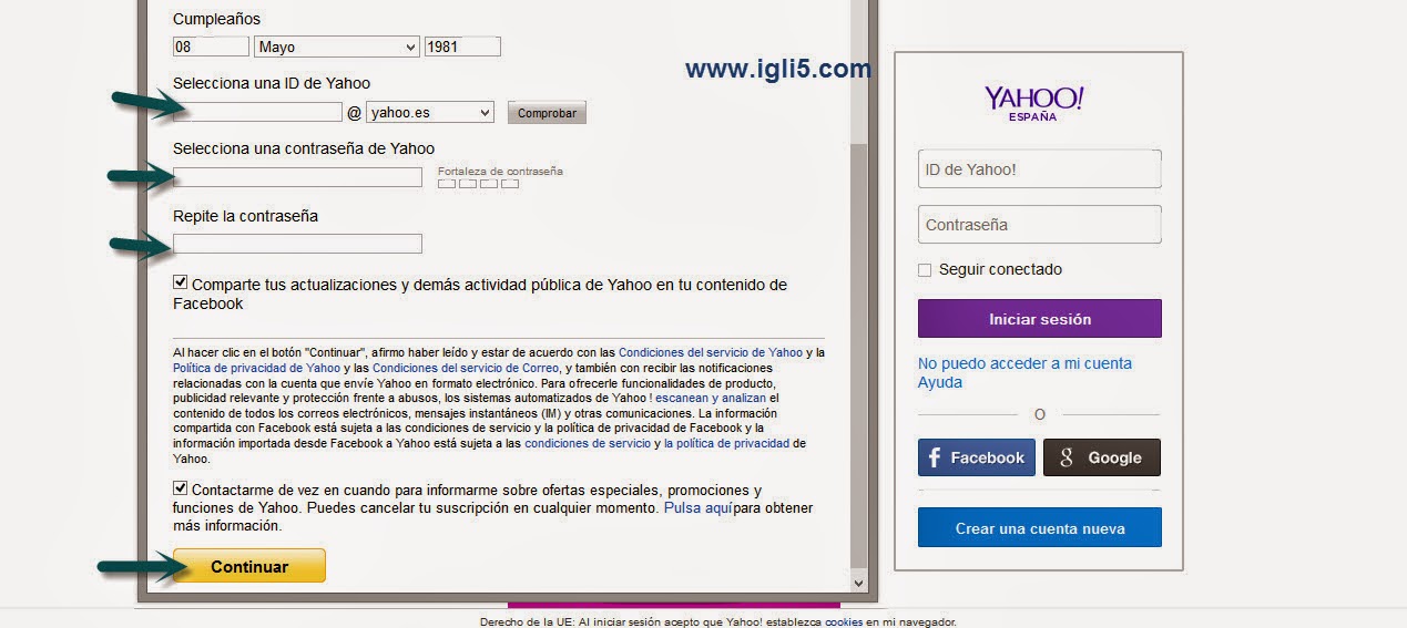 بعد الضغط على facebook لتسجيل حساب على الياهو عبره ، سوف تنبثق لك نافذة صغيرة ، قم بالضغط على موافق ثم بعد ذلك سوف تفتح معك نافذة جديدة ستختار فيها عنوان بريدك الإلكتروني الجديد على الياهو وكلمة السر التي يجب أن تكون بالأحرف الكبيرة والصغيرة والأرقام حتى يتم قبولها ثم تضغط على next كما هو موضح في هذه الصورة: