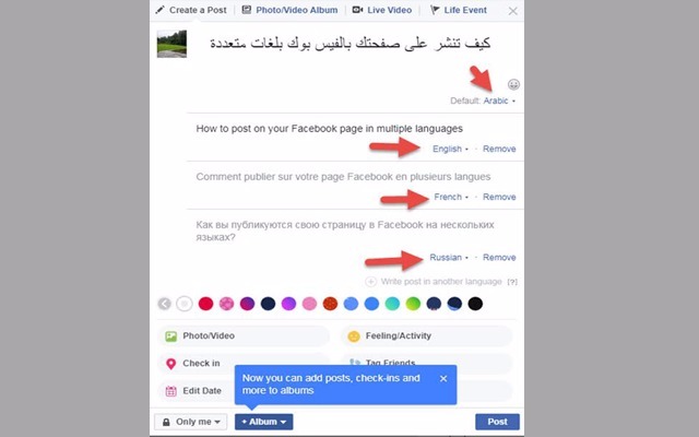 وكذلك يمكنك النشر بأكثر من لغة على صفحتك على الفيس بوك ، وبذلك يستطيع اصداقائك الذين يختلفون معك في اللغة فهم ماتكتب وتنشر بكل سهولة . حيث انك عندما تكتب منشور باللغة العربية وانت تستخدم الصفحة باللغة العربية سوف يظهر لك بنفس لغة الصفحة ، اما المستخدمون الاخرون سوف يظهر لهم أيضآ بنفس لغة صفحاتهم ، أي سوف يظهر لصاحب الصفحة الانجليزية على انه منشور بالانجليزية ، وكذلك الفرنسية او اي لغة تقوم بتحديدها، وتعمل هذه الميزة أيضآ في حالة نشر صور او مقاطع فيديو .
