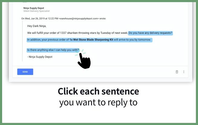 ما تقوم به الإضافة هو تمكين الواجهة بحيث عند النقر فوق أي عبارة من رسالة البريد الإلكتروني التي تجيب عليها ، تتم إضافتها تلقائيًا إلى المحرر ، لذلك عليك فقط إضافة إجابتك أدناه.