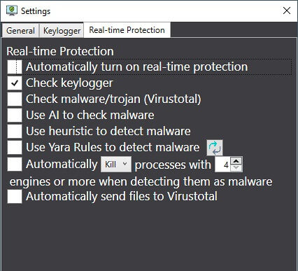 من إعدادات البرنامج يمكنك تفعيل الحماية التلقائية في الوقت الحقيقي وذلك لكشف Key loggers والفيروسات وبإمكانك أيضا استعمال الذكاء الاصطناعي في الكشف عن الفيروسات، مع إمكانية فحص الملفات عبر خدمة Virustotal وheuristic