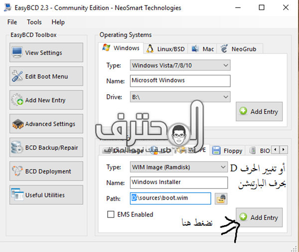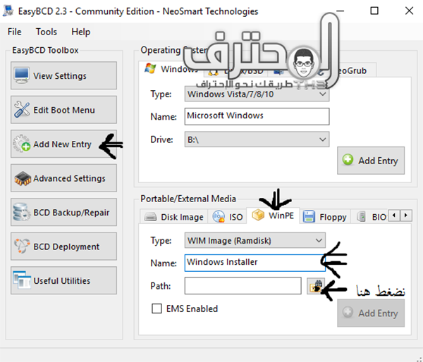نختار Add New Entry ومن الأسفل نختار WinPe