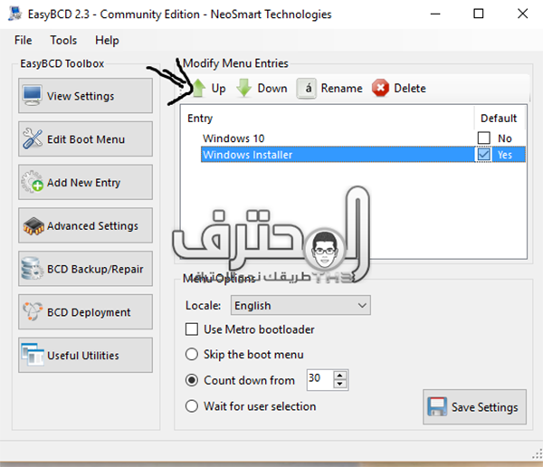 ننتقل الان الى خانة Edit Boot Menu نضع علامة على الاسم الذي اخترناه ونضغط up ثم Save Settings