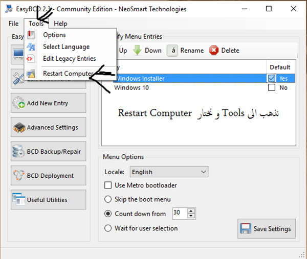 الان انتهى كل شيئ ماعليك سوى الذهاب إلى Tools واختيار Restart Computer وسيبدأ الويندوز بالتثبيت ان شاء الله