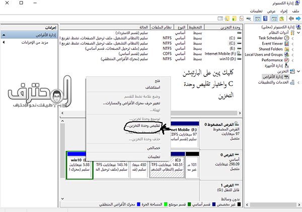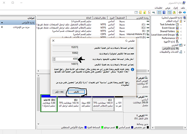 نذهب إلى القرص C كليك يمين و اختيار تقليص وحدة التخزين