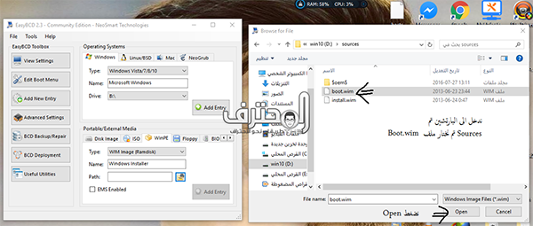 نضع إسم الويندوز أو أي إسم و من أمام Path نضغط و نختار مكان ملف Boot.wim وهو موحود في البارتيشن ثم Sources