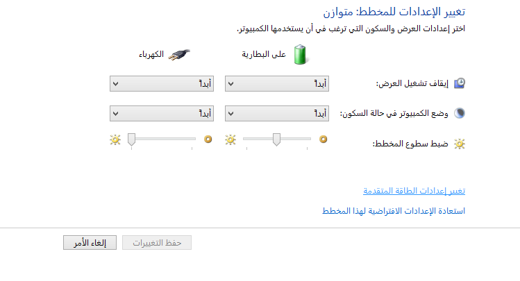 في الإعدادات الافتراضية تكون الخيار ( توفير الحد الأقصى للطاقة ) و