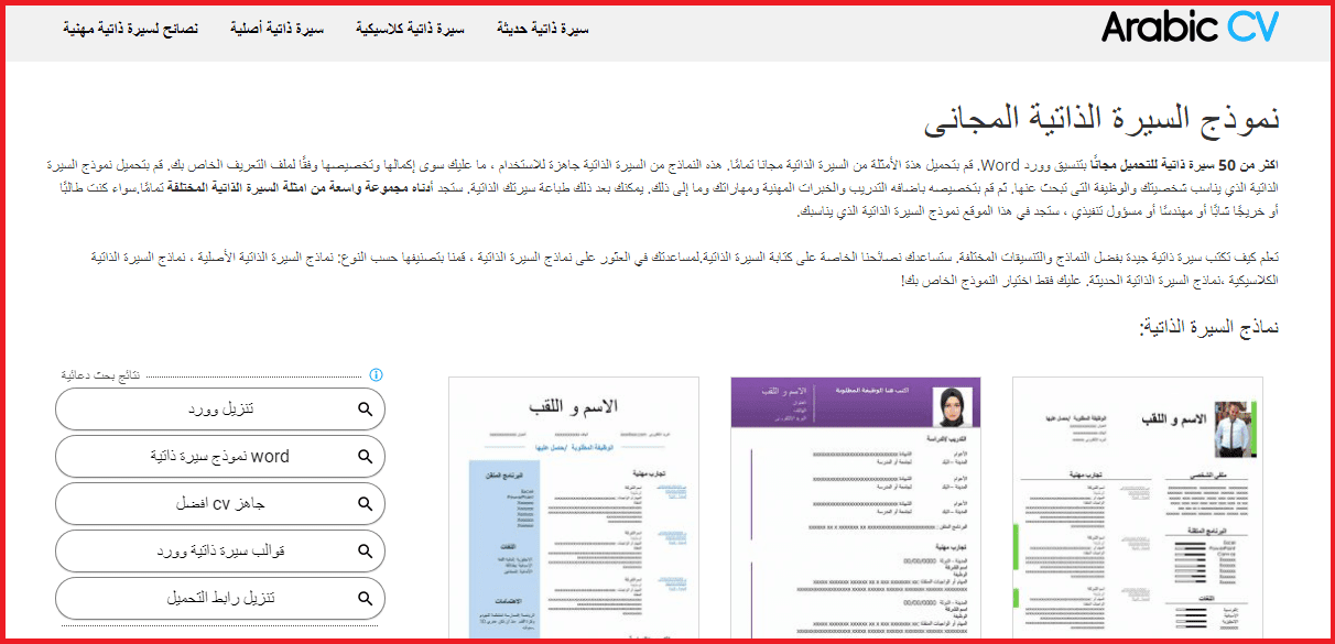 موقع arabic-cvموقع آخر مختلف قليلًا عن الموقع السابق، فهو يوفر لك إمكانية الحصول على عدد كبير من قوالب السيرة الذاتية والمصممة باحترافية باللغة العربية مجانًا، مع هذا فعدد القوالب قابل للزيادة مستقبلًا، إضافة الى ذلك فهو يقدم لك خدمة تحميل مباشرة، مع دعم لإصدار ميكروسوفت وورد القديم وحتى الجديد، وبالتدقيق أكثر نجد أن الموقع يوفر لك خيارات بأعلى الصفحة تسمح بالحصول على نماذج سيرة ذاتية حديثة، كلاسيكية و أصلية، مع تقديم نصائح عديدة وتوضيحات بخصوص السيرة الذاتية CV، وأخيرًا فالموقع يسمح لك بتقييم نماذج مختلفة من السيرة الذاتية، إضافة الى إمكانية مشاركتها عبر منصات التواصل الاجتماعي المختلفة.