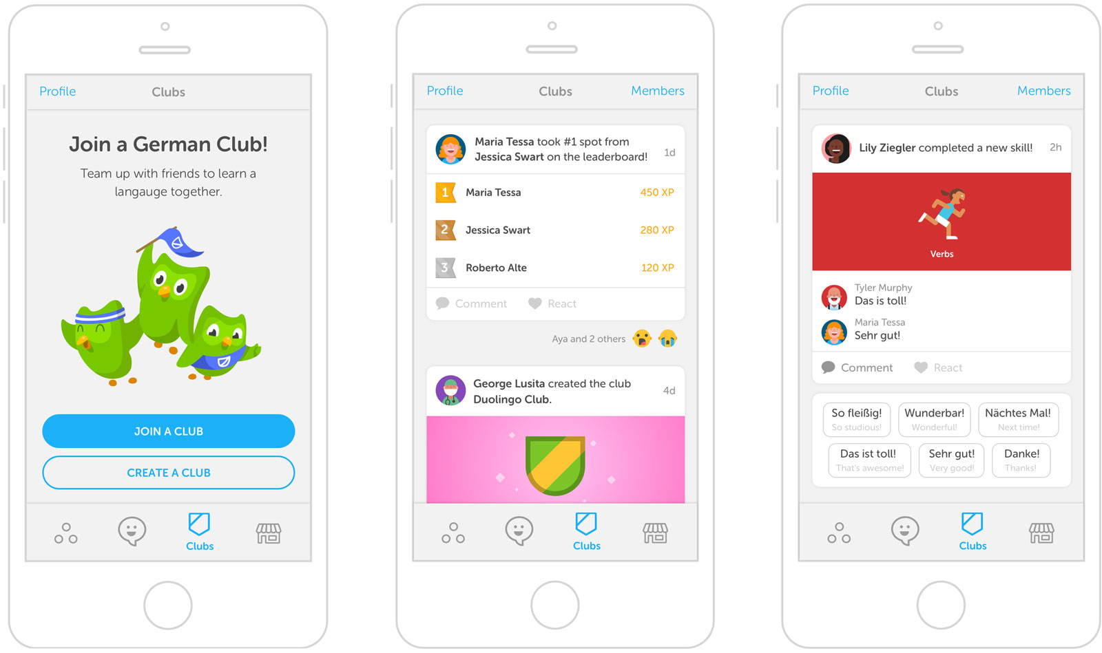 مكنت شركة Duolingo المستخدمين من إنشاء مجموعات لتعلم لغة معينة أو عدة لغات بتبادل الحديث والمواضيع مع باقي الأعضاء ونشر نقاط كل مستخدم للرفع من التنافسية فيما بينهم للحصول على نقاط أكثر أو لنقل لتحفيزهم على التعلم بشكل مستمر.