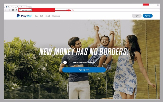 قبل أن تسجل حسابك على موقع ما ، تأكد أنك ضغطت على الرابط الصحيح للموقع ، و في الصورة سترى أن هذا الموقع الوهمي الذي يزعم أنه تابع لشركة بايبال يحمل رابط :
