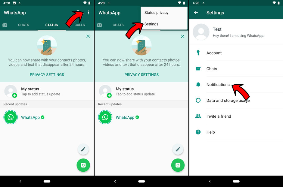 الأمر مشابه بالنسبة لتطبيق واتساب عليك التوجّه للإعدادات في البداية Settings من خلال النقر على النقاط الثلاثية الموجودة في الزاوية العلوية في البداية.