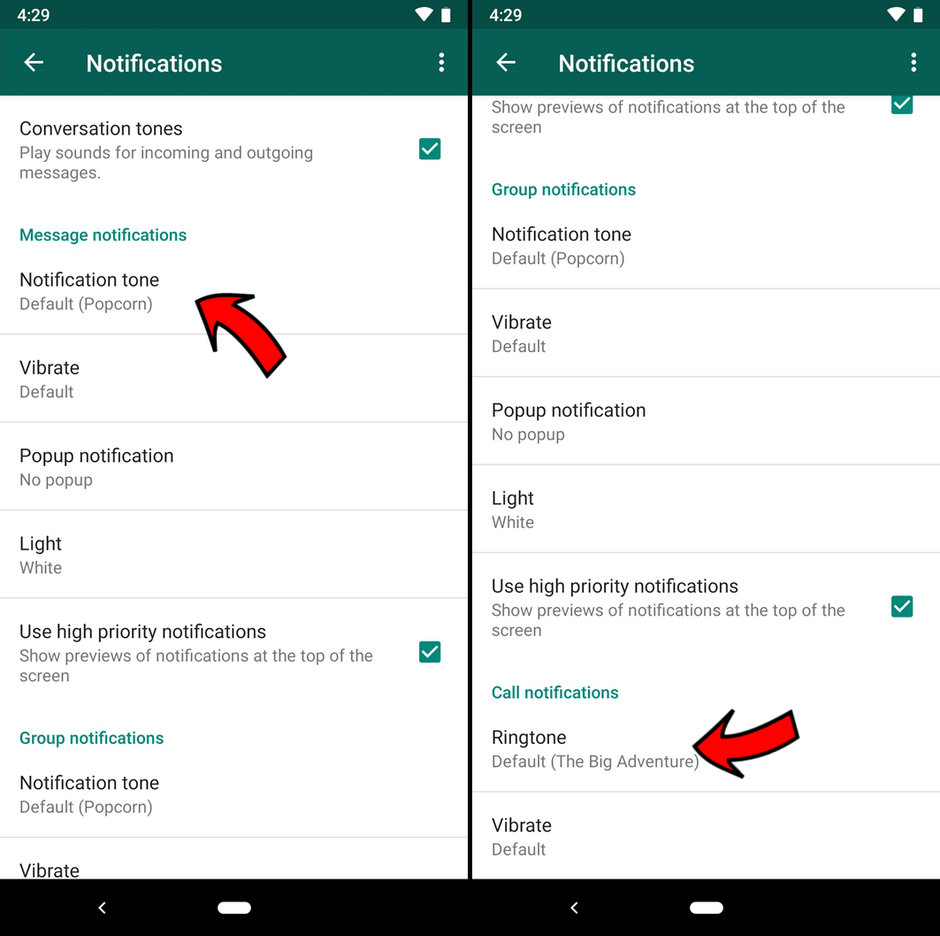 ستظهر لك قائمة مليئة بالخيارات والإعدادات يجب التوجّه إلى أسفل هذه القائمة للعثور على القسم المخصص لتغيير النغمات الخاصّة بواتساب ثم النقر على خيار نغمة الإشعارات Notification tone واختيار النغمة التي ترغب بها من القائمة الموجودة.
