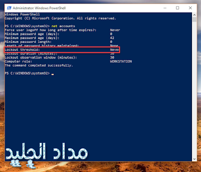 والآن للتحقق من الإجراء أغلق Windows PowerShell ثم أعد فتحه وأدخل الآمر “net accounts” لترى النتيجة