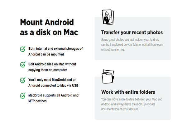 كل ماعليك هو وصل هاتفك الأندرويد مع حاسوبك Mac بكايبل خاص لنقل المعلومات لتتمكن من التعديل على ملفاتك الشخصية بشكل مباشر من الحاسوب دون اللجوء إلى العادة الكلاسيكية القديمة كونك تحمل نسخة من الملفات إلى الحاسوب تم تقوم بتعديلها بإضافة و حذف ما تريد تم تعيد إرجاع الملفات إلى الهاتف, وهذه العملية تأخد وقتا و جهدا كما أنها تهدد سلامة ملفاتك من الضياع.