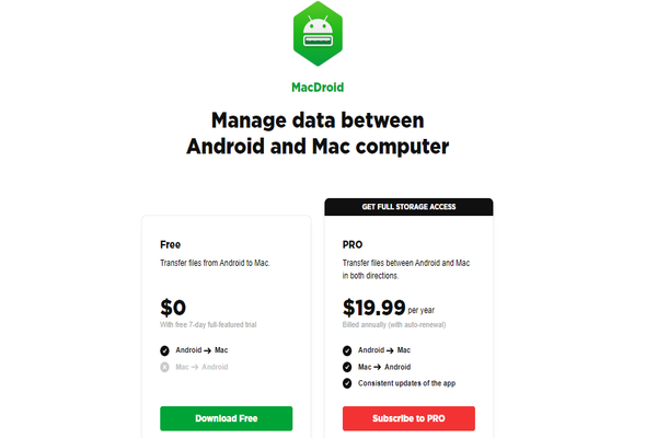 كل هذا الذي ذكر يعطيك نبذة عن البرنامج ليبقى لك تساؤل… و إجابته أن البرنامج متاح بنسختين النسخة المدفوعة و النسخة المجانية كما جاء في الموقع الرسمي لـ MacDroid https://www.macdroid.app/. أنه النسخة المدفوعة يمكنك اقتناؤها بـ 19,99 $ للسنة حيت يمكنك أن تستفيد بعدة مزايا دون قيود, بينما يمكنك تجربة النسخة المجانية و ذلك لتأخد فكرة أكبر حول البرنامج قبل أن تقوم بشرائه و رغم أنها ستكون نسخة بقيود إلا أنها ستعطيك فكرة مبدئية حول قوة البرنامج.