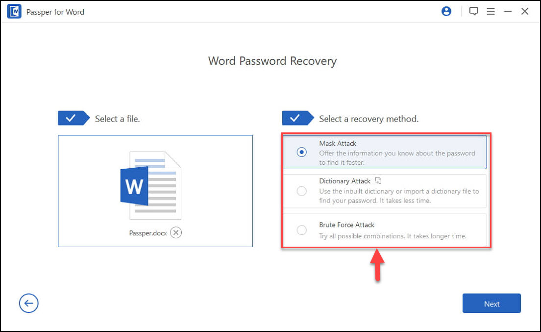 Mask Attack : الوضع مثالي إذا كان لديك فكرة عن كلمة المرور المنسية أو المفقودة. قد يكون مثل طول كلمة المرور أو أي أحرف خاصة . سيقوم البرنامج بعد ذلك باستخدام هذه المفاتيح للوصول إلى كلمات مرور محتملة للمستند.