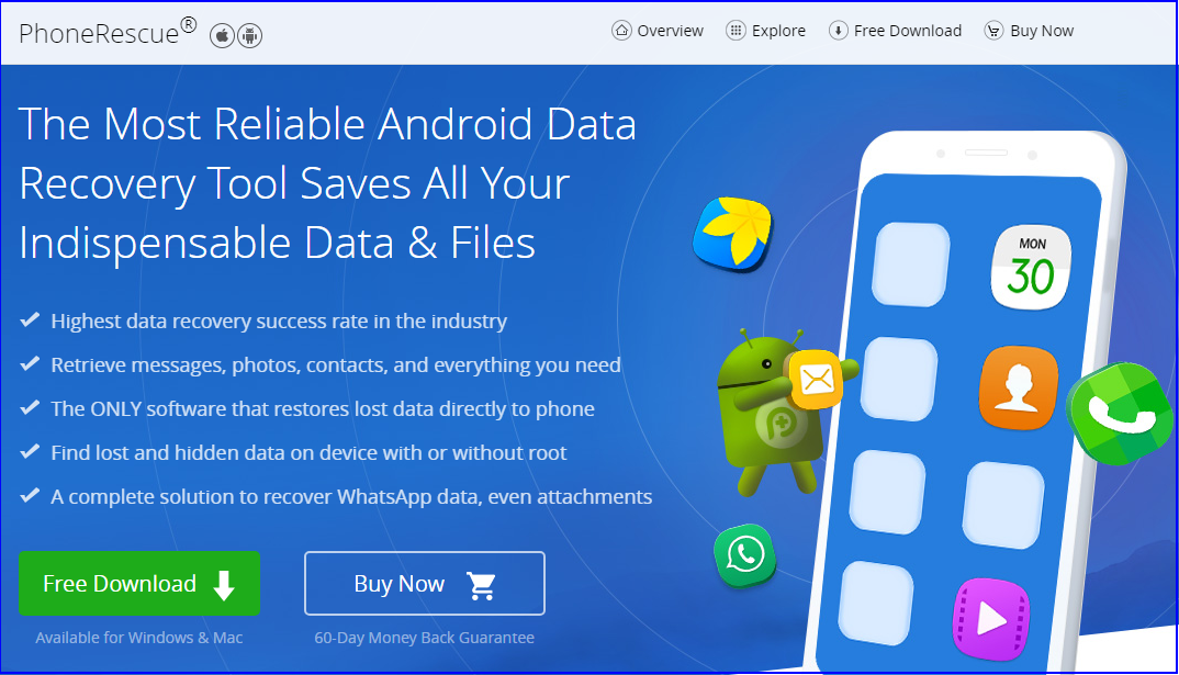 PhoneRescue باستعادة الصور أو مقاطع الفيديو فحسب ، بل وأيضاً كل أنواع البيانات التي يمتلكها Android. سواء قمت بحذف رسالة حب جميلة من شخص مميز أو مقطع فيديو مضحك من أصدقائك على WhatsApp ، فيمكنه استردادها جميعًا. يمكنك استعادة جميع الرسائل والصور ومقاطع الفيديو وجهات الاتصال والتقويم والموسيقى ووثائق التطبيق وسجلات المكالمات وما إلى ذلك. يمكنك حتى استعادة بيانات التطبيق المحذوفة على هاتف Android باستخدام PhoneRescue.