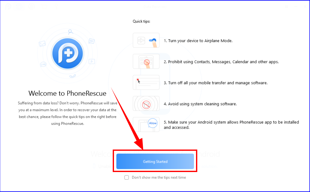 ستوفر لك الصفحة الأولى من البرنامج بعض النصائح السريعة التي يجب اتباعها عند فقد بياناتك قبل استخدام PhoneRescue. تحتاج الآن إلى النقر فوق الزر “بدء الاستخدام” للمتابعة إلى الخطوة التالية.