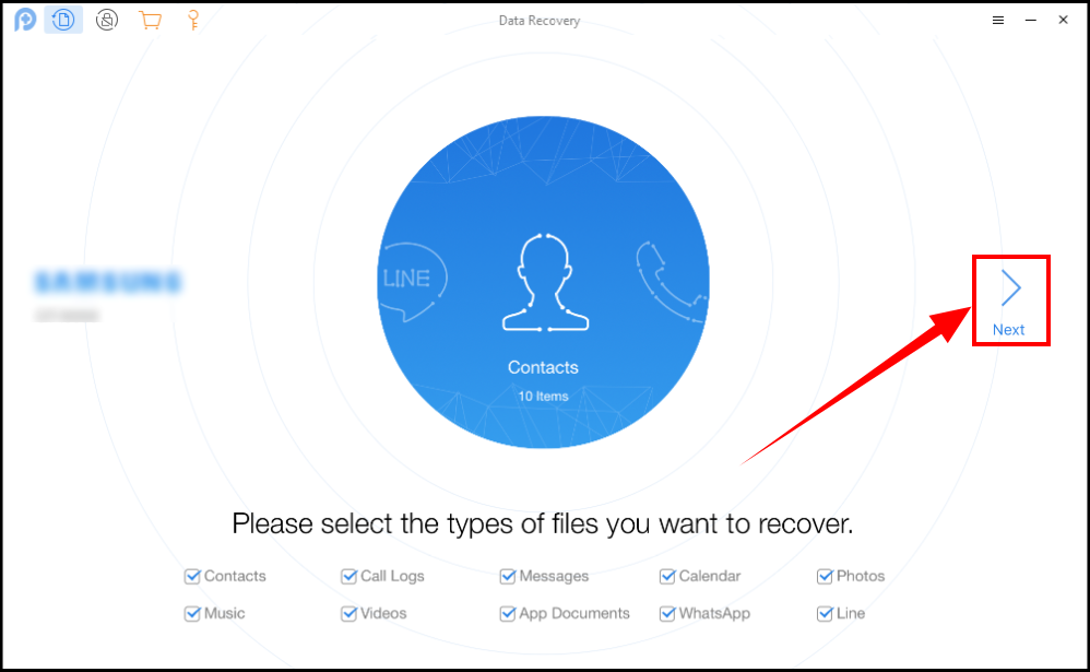 بمجرد التعرف على جهاز Android ، سترى واجهة جديدة كما هو موضح في الصورة أدناه. سيوفر لك خيارات لاختيار نوع البيانات الذي ترغب في استعادته على جهاز Android. يمكنك اختيار كل منهم أو واحد المطلوب. لذلك ، اختر نوع البيانات المراد استردادها وانقر فوق الزر “التالي”.