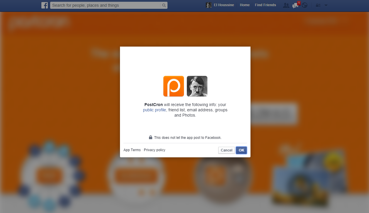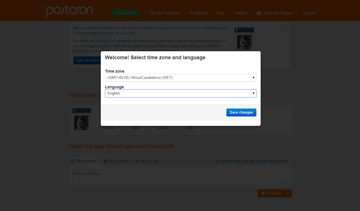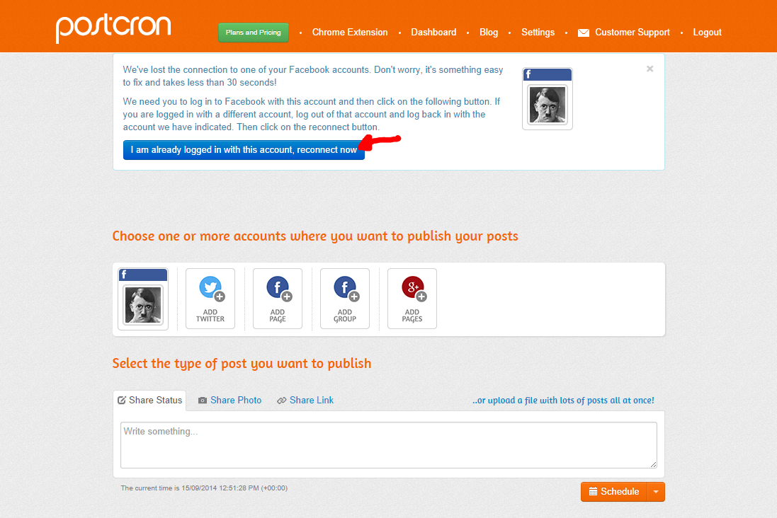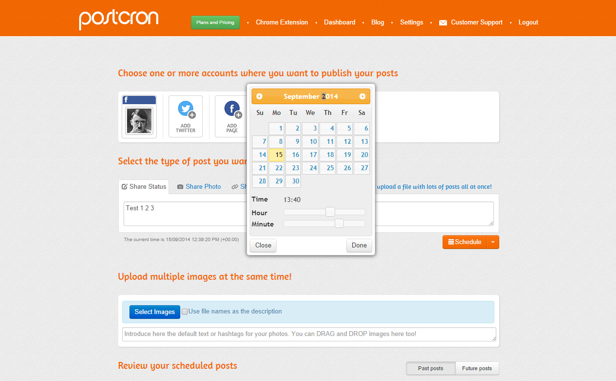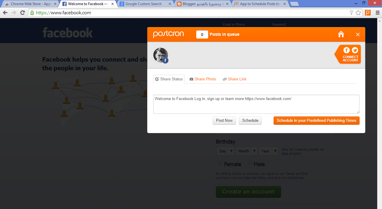 Postcron هي إضافة تقوم بجدولة المنشورات لتنشر بعد ذلك بشكل أوتوماتيكي بالتويتر، غوغل بلس، فيسبوك، حيث بإمكانك نشر صورة و تعليق، ارتباط و تعليق أو منشور عادي، إضافة لنشر ملف مختلف كما يمكنك نشر أكثر من صور كما يوفر إضافة خاصة بمتصفح غوغل كروم الشيء الذي يغنيك عن ولوج موقع الخدمة.