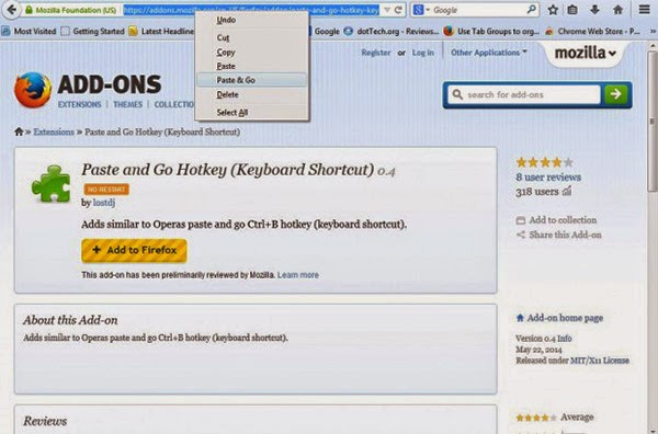 Paste and Go Hotkeyشريط العنوان في متصفح فايرفوكس لديه عدد قليل من الخيارات التي يمكنك الاختيار من بينها بزر الماوس الأيمن كما هو الحال في متصفح جوجل كروم ، ومن أهم هذه الخيارات التي تسرع عملها في هذا المتصفح هي ميزة “Paste and Go” اللصق والذهاب مباشرة للرابط دون ان تضغط على زر”Enter” من لوحة المفاتيح أو شيء من هذا القبيل ، طبعا هذا الأمر أصبح كذلك ممكنا لمستعملي فيرفوكس عبر إضافة “Paste and Go Hotkey”.