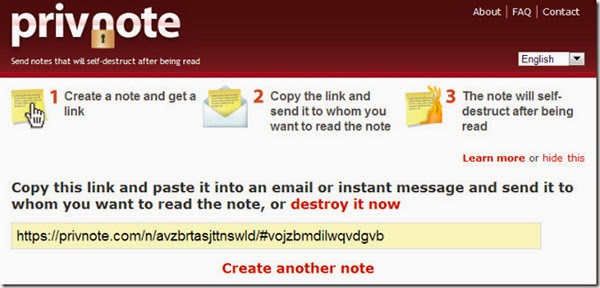 رسالة سرية أو ملاحظة لشخص ما وفي نفس الوقت عند قرائتها من قبل الطرف الاخر تمسح تلقائيا وتدمر لضمان سرية المعلومة ،فهذا الموقع إذن سيكون ما تبحث عنه .بالإضافة لذلك يمكنك معرفة هل تم قراءة رسالتك أم لا .