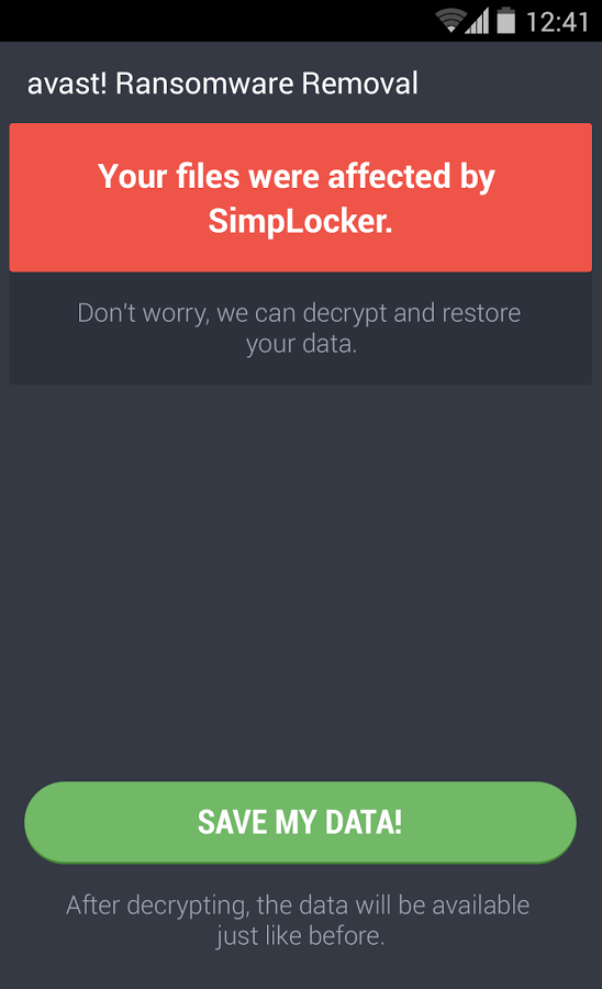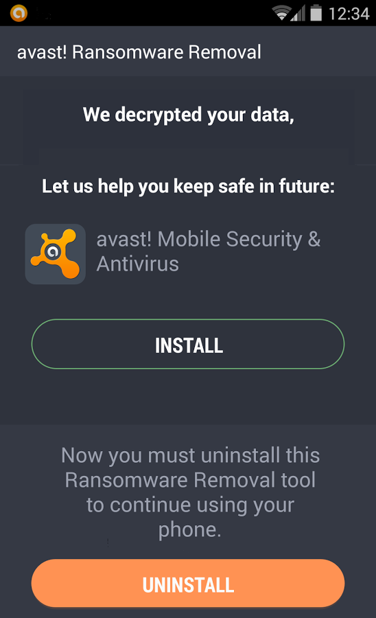 ذلك سيكون من خلال تطبيق avast! Ransomware Removal الأخير الذي أطلقته شركة الحماية الرائدة avast حيث يمكنك من خلاله القيام بفحص وإزالة ال Ransomware التي على هاتفك كما يفك تشفير الملفات المتأثرة مما سيساعدك على استرجاع ملفاتك بدون أضرار.