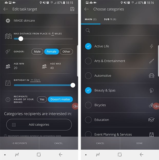 الفئات : خيار آخر هو إضافة فئات يهتم بها عملاؤك. عندما تضيف فئات ، سيتم إرسال الرسائل فقط إلى أولئك الذين بحثوا عن أماكن داخل تلك الفئات.