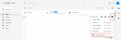 أيضا هناك ميزة جميلة هو في حال تحصلت على العديد من الرسائل و في نفس الوقت تود تأجيل قراءتها في هذه الحال ما عليك سوى ان تقوم بتعليم كل الرسائل و فور تعليمك على الرسائل سيظهر شريط أعلى علبة الواردات به العديد من الأيقونات لكل أيقونة دور فقط قم بالبحت على أيقونة Snooze  و التي كما سبق أشرنا إليها أيقونة تتمثل على شكل ساعة و منه سيتعين عليك اختيار الوقت الأنسب لك لتذكيرك بالرسائل.
