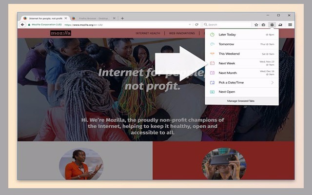 أدخلت فايرفوكس ميزة تجريبية أسمتها غفوة علامات التبويب التي تزيل علامة التبويب من المتصفح وتعيده وقتما تشاء، الميزة لا تزال تجريبية هي جزء من برنامج الاختبار التجريبي الذي أعلنت عنه موزيلا العام الماضي.