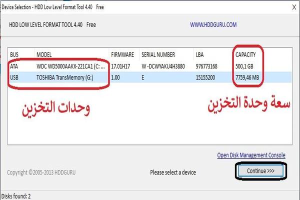 ستظهر لك واجهة البرنامج على الشكل التالي، جميع وحدات التخزين المتصله بحاسوبك سوف تظهر لك، بما فيها القرص الصلب الخاص بحاسوبك، ركز جيدا وتأكد من وحدة التخزين التي تريد عمل لها إعادة ضبط وضع المصنع، تستطيع ان تعرف وحدة التخزين فقط من خلال سعة وحدة التخزين. بعد النقر على وحدة التخزين المراد إصلاحها، تضغط بعد ذلك على “Continue”.