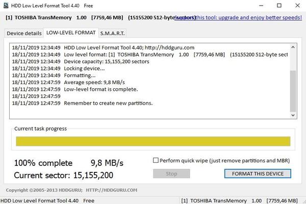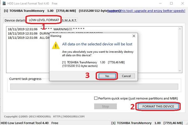 تذهب الآن لخيار “Low Level Format”، ثم على “Format this device”، وفي الاخير على “Yes” وسيشرع البرنامج في إعادة وضع وحدة التخزين الى وضع المصنع. العملية سوف تستغرق بعض الوقت حسب سعة وحدة التخزين. لا تستعجل في العملية واترك الجهاز لتتم عملية التصليح بنجاح.