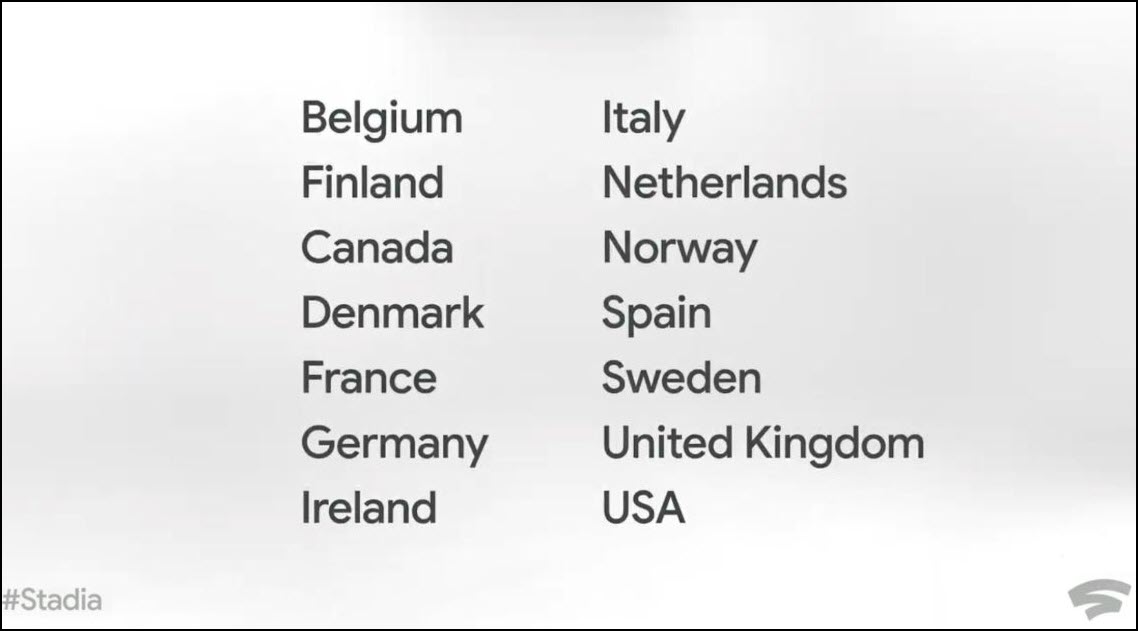 فيما يتعلق بتوفرها ، سيتم اختيار 14 دولة لتنفيذ أول نشر للخدمة ، وسيكون من الضروري في البداية استخدام Google Chromecast لاستخدام خدمة Stadia ، على الرغم من أنه لاحقًا في مرحلة ما من عام 2020 يمكن لعب ألعاب الفيديو على أي جهاز يمكن فتح فيه غوغل كروم .