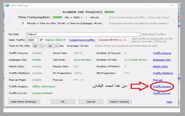 برنامج اكثر من رائع يمكنك من خلال جلب مالايقل عن 25 الف زيارة يوميا لموقعك ومايميز البرنامج هو امكانية تحديد مصدر الزوار ، فيمكنك اختيار زوار من الدول الاجنبية او العربية مع خصاية تحديد مدة بقاء الزائر عند تبيت البرنامج لاتغيير من اعدادته فهي مضبواطه بالفعل.