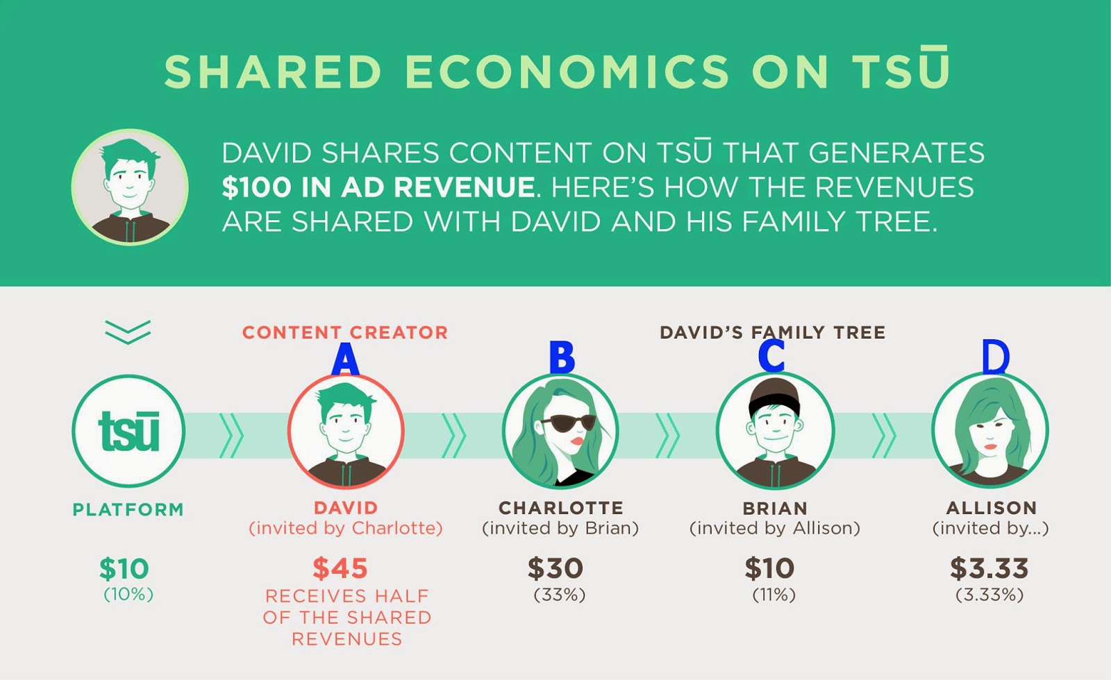 لنفارض أن أخر عضو A قام بمشاركة صورة مثلاً و هذه الصورة حققت عدد جيد من المشاركات والتعليقات + الإعجابات و ربح من خلالها 100 دولار , إذن ستقوم شركة ” تسو ” باقتطاع 10 بالمائة لصالحها و سيتبقى للعضو A 90 دولار أليس كذلك؟