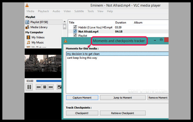 تعتبر ميزه مهمه لهواة مشاهدة الأفلام والمسلسلات وهى وضع علامات Bookmarks على الأجزاء المهمة في الفيلم المسلسل التي تريد الرجوع اليها في وقت لاحق، وذلك دون البحث عنها. كما يمكنك وضع أكثر من علامة في نفس الفيديو وترتيبهم في Play list فيمكنك تشغيلهم بشكل أسرع.