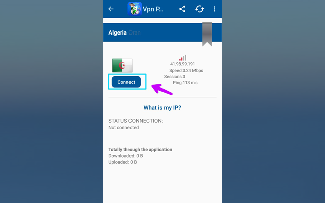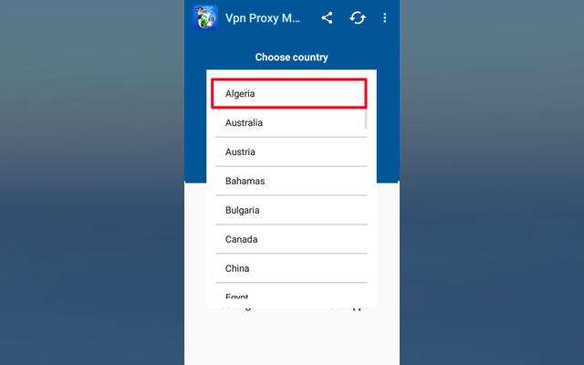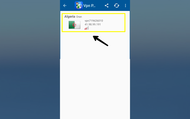 الآن من هذه اللائحة ستجد عنوانين الاتصال الأجنبية و كذلك العربية حيث كما ترى في الصورة توجد دولة الجزائرنقوم باختيارها ، و للإشارة إذا لم تجد دولتك العربية فقط أعد فتح التطبيق من جديد و سيتم تحميل سيرفيرات دول أخرى حيث أول استعمالي للتطبيق وجدت سيرفر اتصال مغربي و تونسي و مصري …